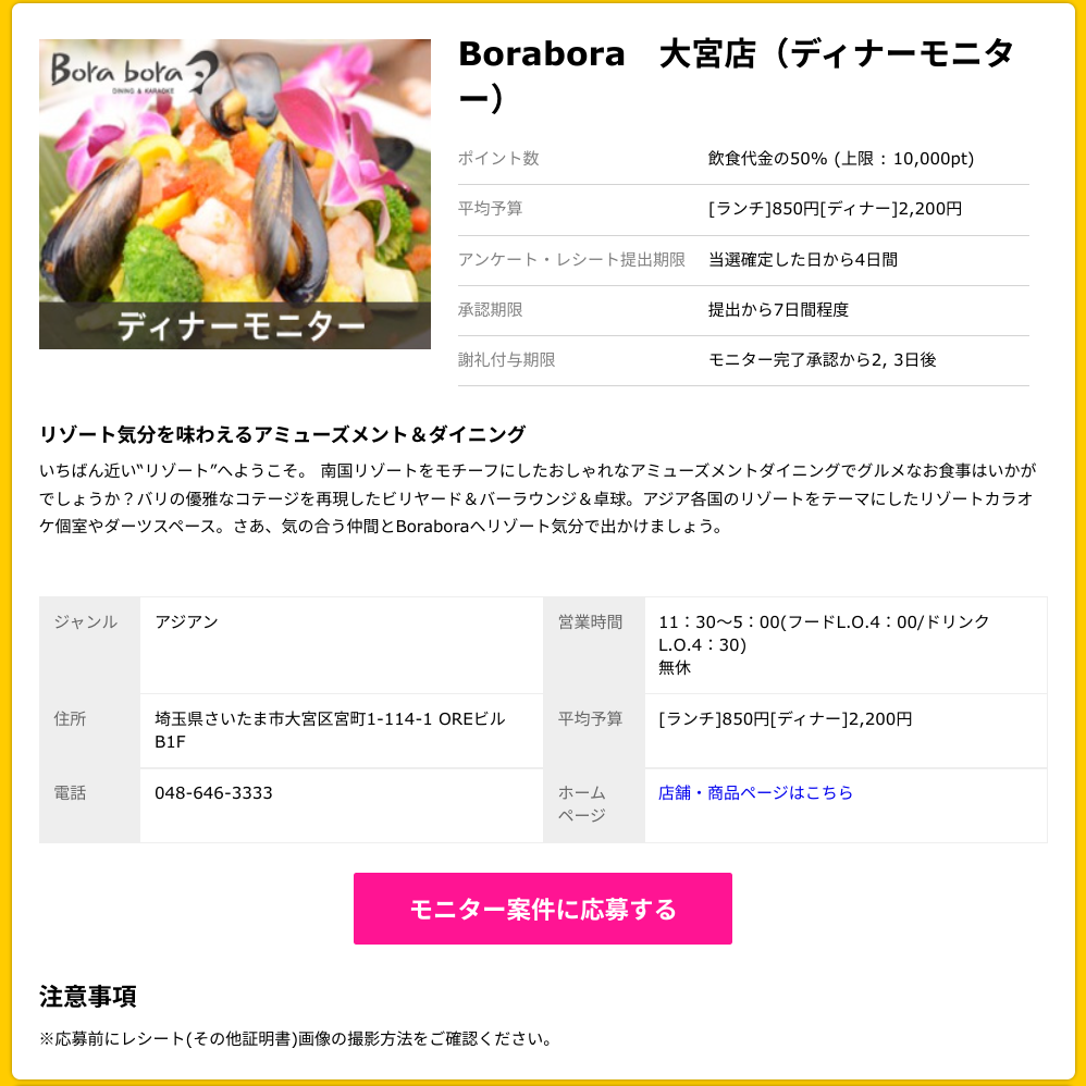 具体的には、飲食店のモニター調査の案件に応募して、実際にその飲食店で食事をして、アンケートと領収書を提出すればハピタスポイントを獲得できます。